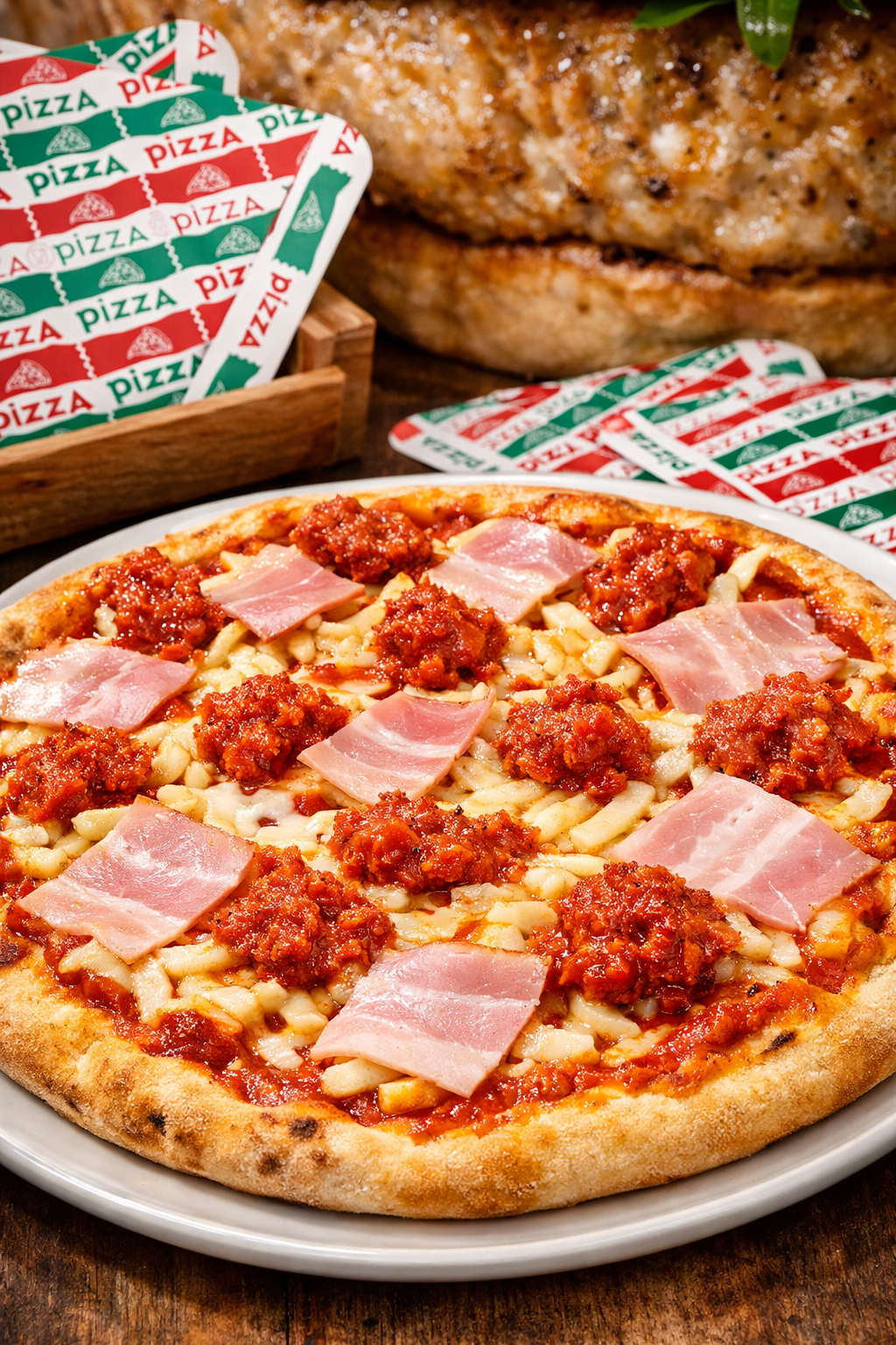 | Base (harina de TRIGO, agua, SÉMOLA DURA, aceite de oliva virgen extra, sal, potenciador de la harina, levadura, extracto seco de MALTA), pechuga de pollo sabor chorizo (Pechuga de pollo 98%, pimentón, dextrosa, dextrina, ajo, colorante (cochinilla), bacon ( bacon de cerdo (76%), agua, sal, lactato potásico, diacetato sódico, nitrito sódico, estabilizantes, proteína de cerdo, aromas, azúcar, aroma de humo, antioxidante ( eritorbato sódico) dextrosa. , QUESO bajo en grasa (LECHE pasteurizada, almidón, sal, fermento láctico, cuajo microbiano), salsa de tomate (pulpa de tomate, sal, orégano), especias.